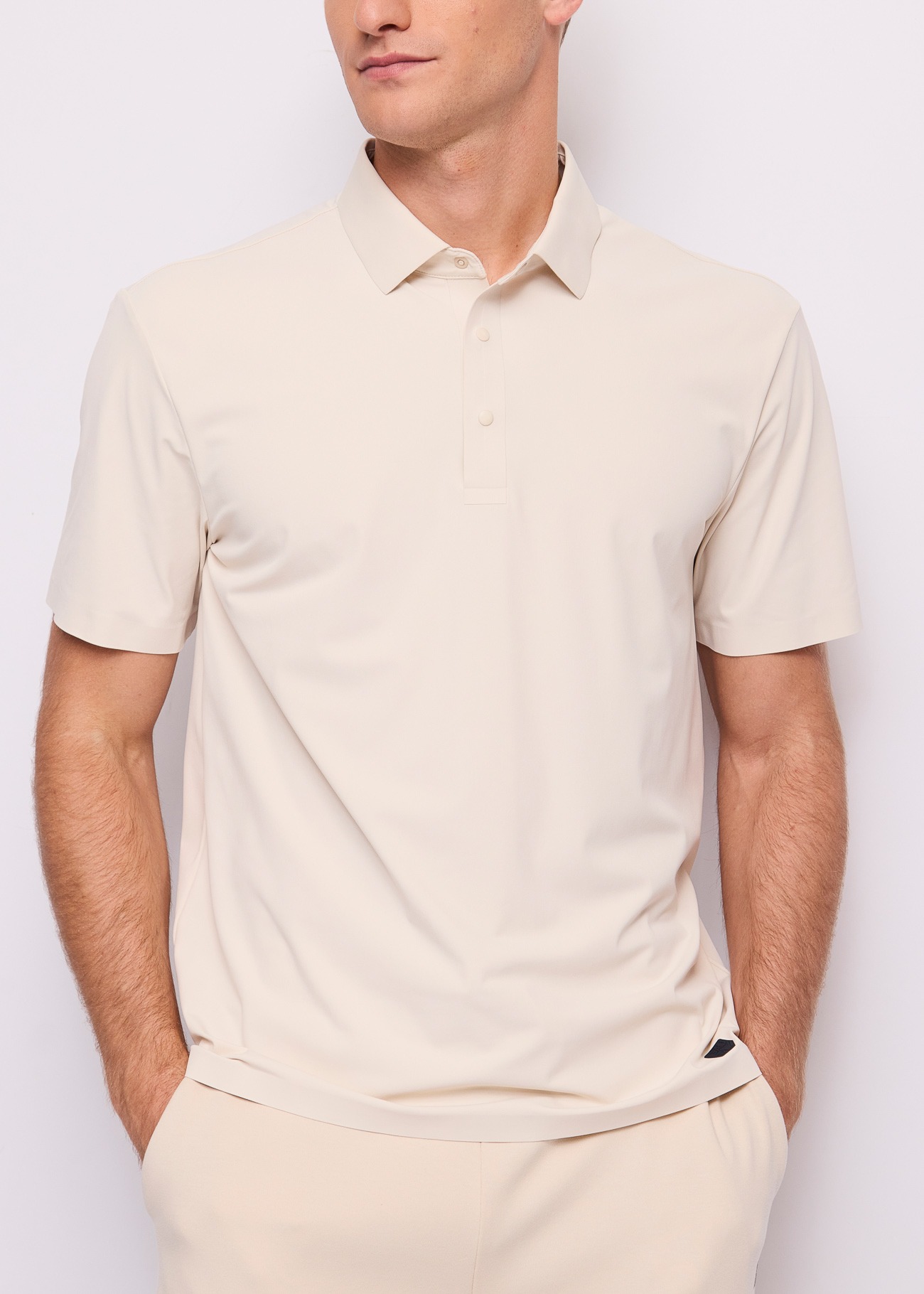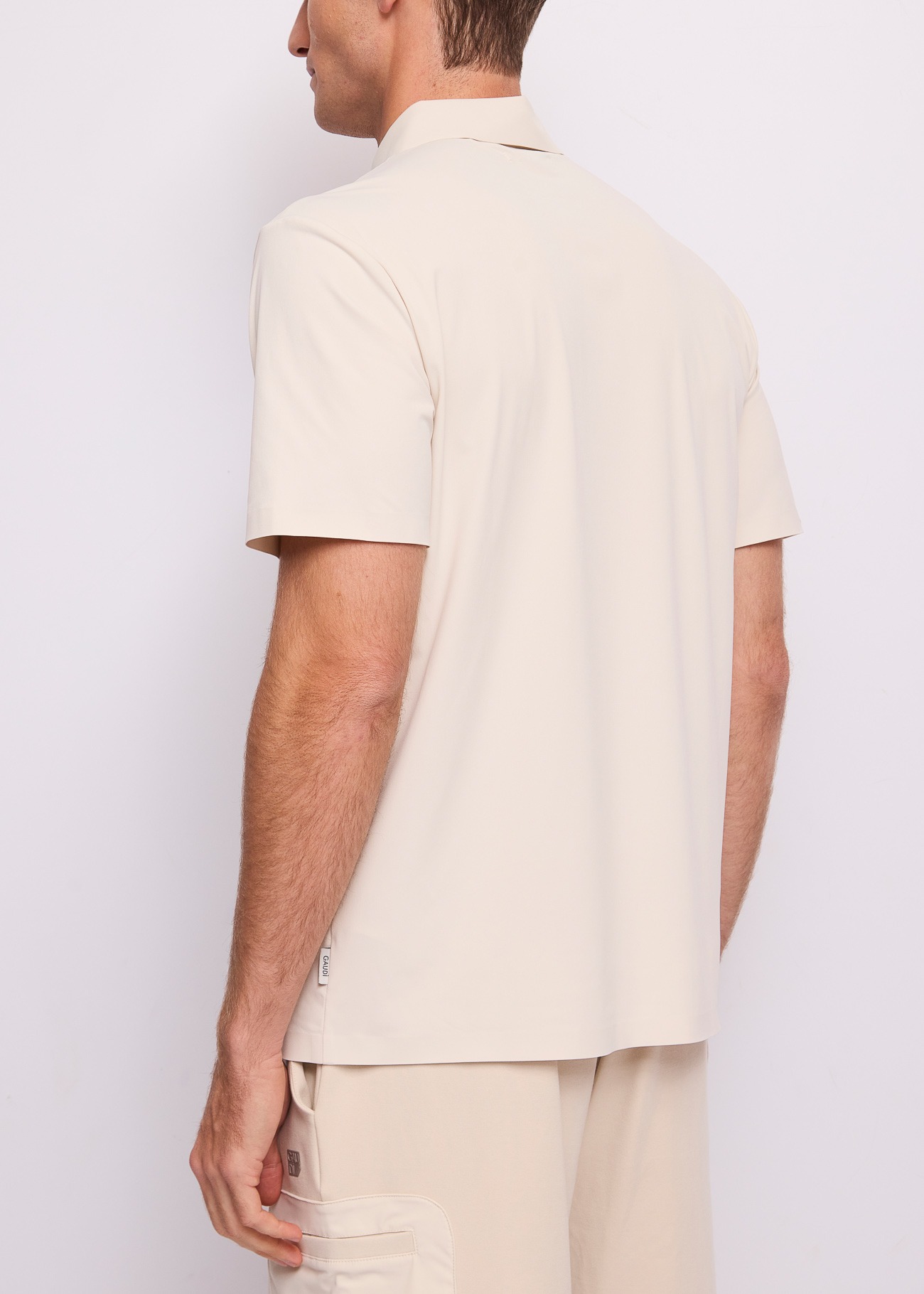 Σε μια φωτεινή, ευέλικτη ανοιχτή μπεζ απόχρωση (της άμμου/cream), η μπλούζα ξεχωρίζει για τη λεία και απαλή υφή του υφάσματός της, που “στρώνει” άψογα στο σώμα. Ο σχεδιασμός της είναι απόλυτα “καθαρός” (minimal): διαθέτει γιακά από το ίδιο ύφασμα, τελείωμα χωρίς ριμπ λάστιχα στα μανίκια και πατιλέτα με κουμπιά στην ακριβώς ίδια απόχρωση (tonal) με το ρούχο, δημιουργώντας ένα ομοιόμορφο, sleek αποτέλεσμα. Ένα μικρό, διακριτικό λογότυπο της Gaudi βρίσκεται στο κάτω αριστερό τελείωμα.