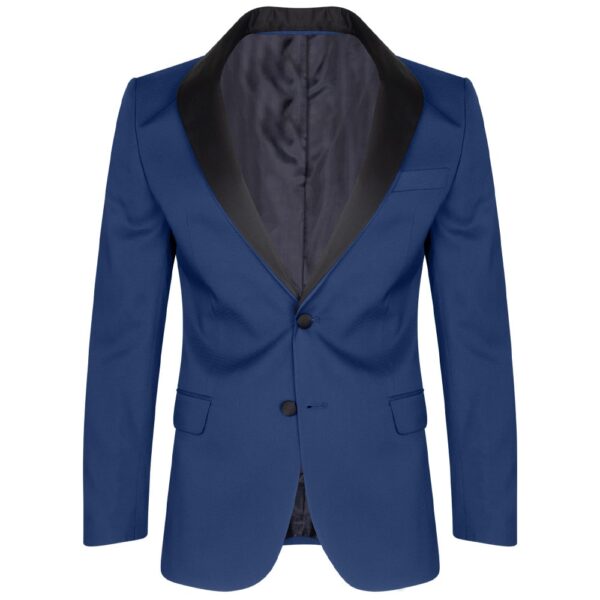 Αναδείξτε το στυλ σας με αυτό το κομψό και διαχρονικό μπλε σμόκιν. Το σετ περιλαμβάνει σακάκι με σατέν γιακά τύπου shawl και αντίστοιχο παντελόνι σε στενή γραμμή.