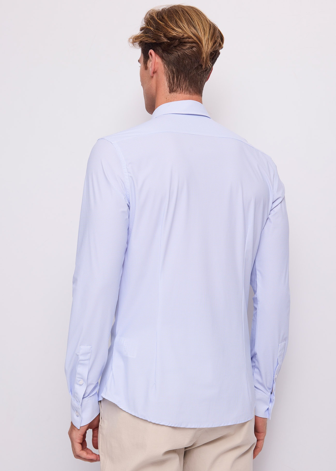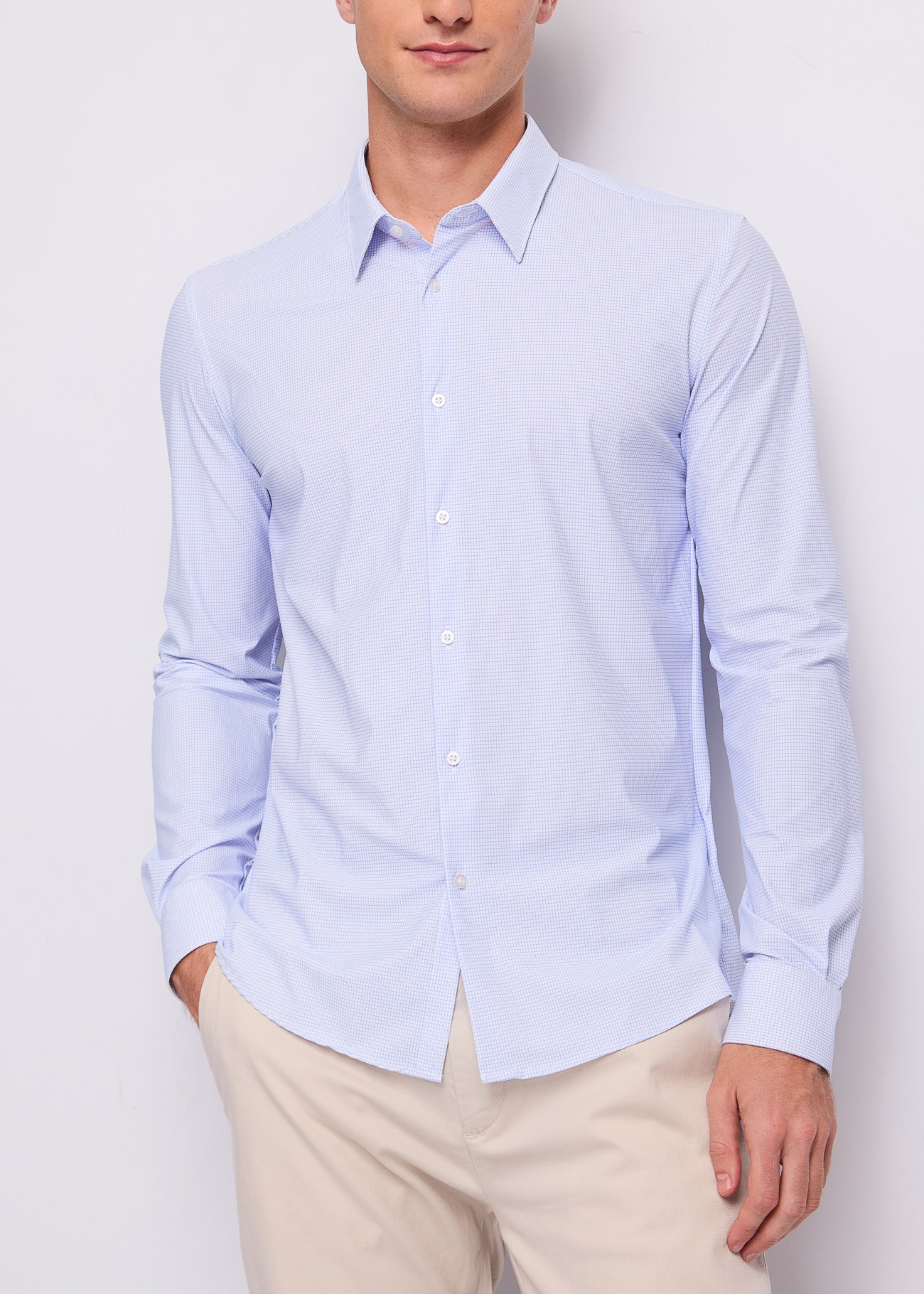 Από μακριά φαίνεται σαν ένα δροσερό, μονόχρωμο γαλάζιο πουκάμισο, ωστόσο από κοντά αποκαλύπτει ένα υπέροχο, πολύ ψηλό μικροσχέδιο (micro-check/καρό) σε γαλάζιους και λευκούς τόνους. Διαθέτει καθαρό, μίνιμαλ σχεδιασμό χωρίς τσέπη στο στήθος, κλασικό γιακά και λευκά κουμπιά που δένουν αρμονικά με το μοτίβο. Η εφαρμογή του (tailored/regular fit) είναι προσεκτικά σχεδιασμένη ώστε να αγκαλιάζει τον κορμό, ενώ το καμπυλωτό του τελείωμα σας επιτρέπει να το φορέσετε τόσο μέσα όσο και έξω από το παντελόνι.