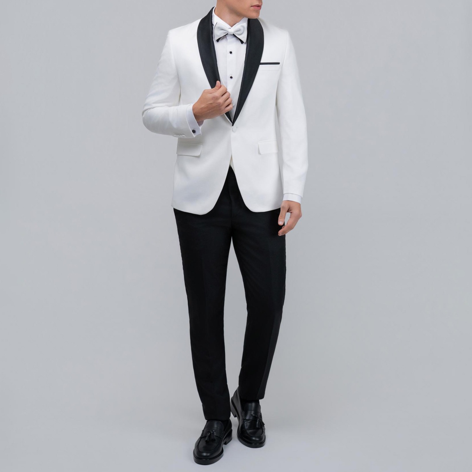 Πρόταση Στυλ (Style Tip): Η επιτομή του Hollywood glamour. Για ένα αψεγάδιαστο γαμπριάτικο σύνολο, συνδυάστε το όπως προτείνεται στη φωτογραφία: με ένα ειδικό λευκό πουκάμισο για σμόκιν με μαύρα διακοσμητικά κουμπιά (studs) στο στήθος και το δικό του παπιγιόν. Ολοκληρώστε την εμφάνιση με μαύρα δερμάτινα λουστρίνια ή κλασικά tassel loafers για μια μοντέρνα, πολυτελή πινελιά.