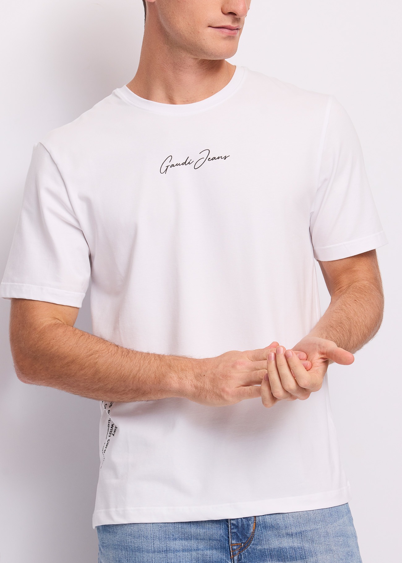 Στο κέντρο του στήθους δεσπόζει το λογότυπο “Gaudi Jeans”, τυπωμένο με μια ιδιαίτερα κομψή, μαύρη καλλιγραφική (cursive) γραμματοσειρά, δημιουργώντας μια ωραία, διακριτική αντίθεση. Μια απροσδόκητη, μοντέρνα πινελιά (urban detail) κρύβεται στο κάτω μέρος της δεξιάς πλευρικής ραφής, όπου υπάρχει ένα κάθετο τυπογραφικό σχέδιο. Διαθέτει άνετη στρογγυλή λαιμόκοψη και κανονική εφαρμογή (regular fit) που εξασφαλίζει δροσιά και ελευθερία κινήσεων όλη την ημέρα.