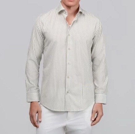 Το πουκάμισο διαθέτει κλασικές κάθετες ρίγες (bengal stripes) σε έναν υπέροχο, αρμονικό συνδυασμό απαλού λαδί (olive/sage green) και καθαρού λευκού. Σχεδιασμένο σε άψογη, εφαρμοστή γραμμή (tailored fit), αγκαλιάζει τον κορμό κολακευτικά εξασφαλίζοντας παράλληλα άνεση στις κινήσεις. Διαθέτει κλασικό γιακά, μίνιμαλ μπροστινό μέρος χωρίς τσέπη και διακριτικά ανοιχτόχρωμα κουμπιά που δένουν τέλεια με τη χρωματική του παλέτα. Η οριζόντια φορά της ρίγας στις μανσέτες προσθέτει μια επιπλέον, διακριτική σχεδιαστική πινελιά.
