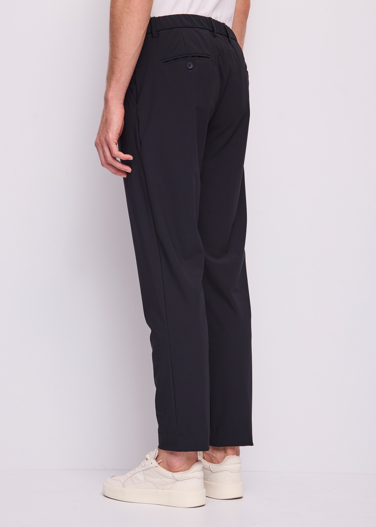 Το μυστικό της επιτυχίας του κρύβεται στον έξυπνο σχεδιασμό της μέσης: ενώ το μπροστινό μέρος διατηρεί την κλασική, “tailored” όψη ενός chino παντελονιού με θηλάκια για ζώνη, το πίσω μέρος διαθέτει ελαστική φάσα (λάστιχο) που εξασφαλίζει την άνεση μιας φόρμας καθ’ όλη τη διάρκεια της ημέρας. Η γραμμή του είναι μοντέρνα, στενεύοντας ελαφρώς προς τα κάτω (tapered), ενώ το ελαφρώς κοντό (cropped) μήκος του αναδεικνύει ιδανικά τα υποδήματά σας.