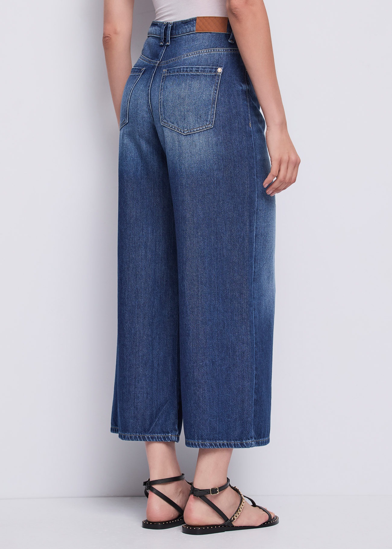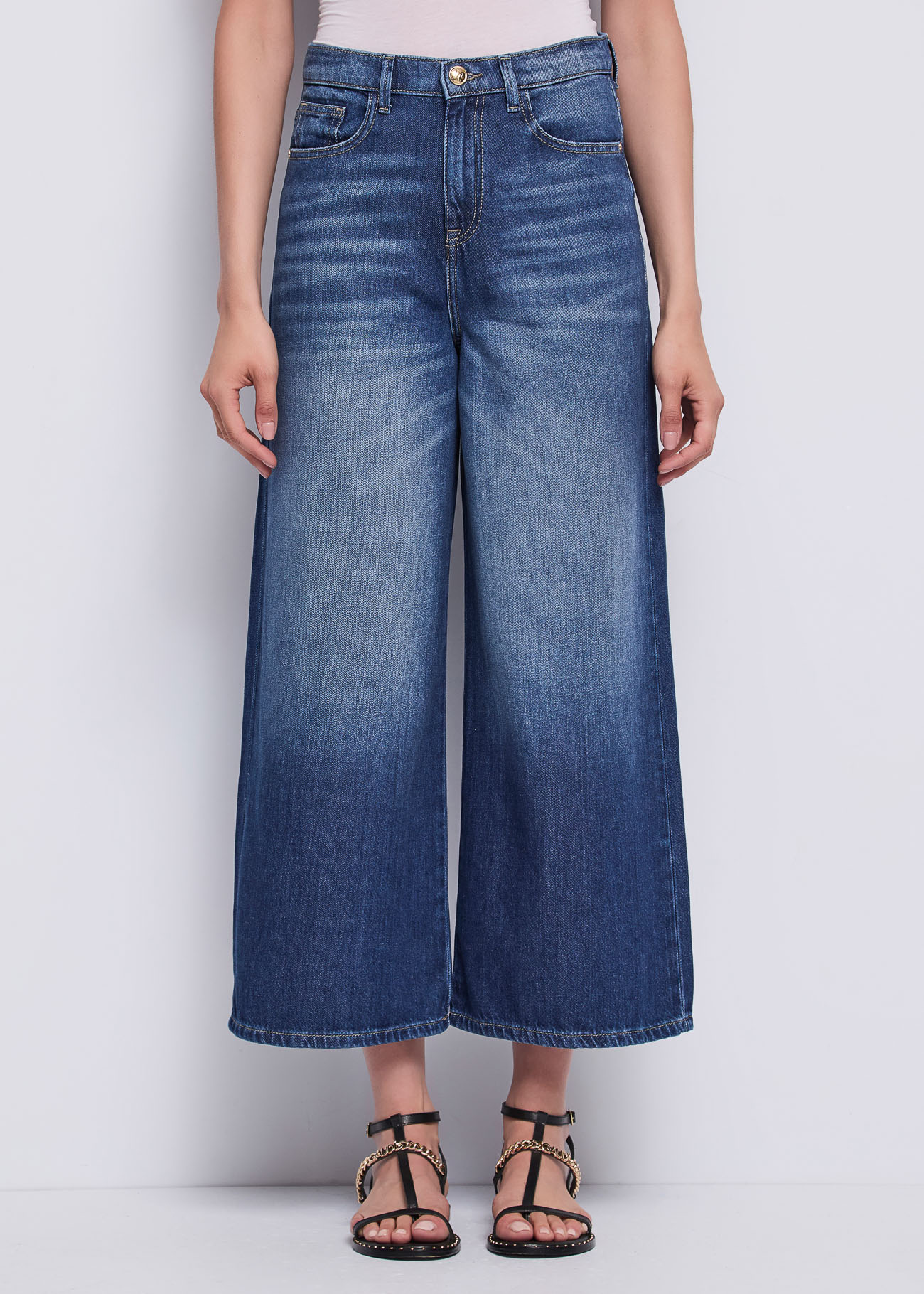 Σχεδιασμένο σε φαρδιά γραμμή (wide-leg / τύπου culotte) που σταματάει κομψά πάνω από τον αστράγαλο, κολακεύει τη σιλουέτα προσφέροντας ταυτόχρονα απόλυτη ελευθερία κινήσεων. Η μεσαία μπλε απόχρωσή του (medium wash) εμπλουτίζεται με στρατηγικά τοποθετημένα, διακριτικά ξεβάμματα στους μηρούς και το πίσω μέρος, χαρίζοντας μια αυθεντική, vintage αίσθηση. Διαθέτει κλασικό πεντάτσεπο σχεδιασμό, εντυπωσιακό χρυσό κουμπί και την χαρακτηριστική ετικέτα με το λογότυπο της εταιρείας στο πίσω μέρος της μέσης.