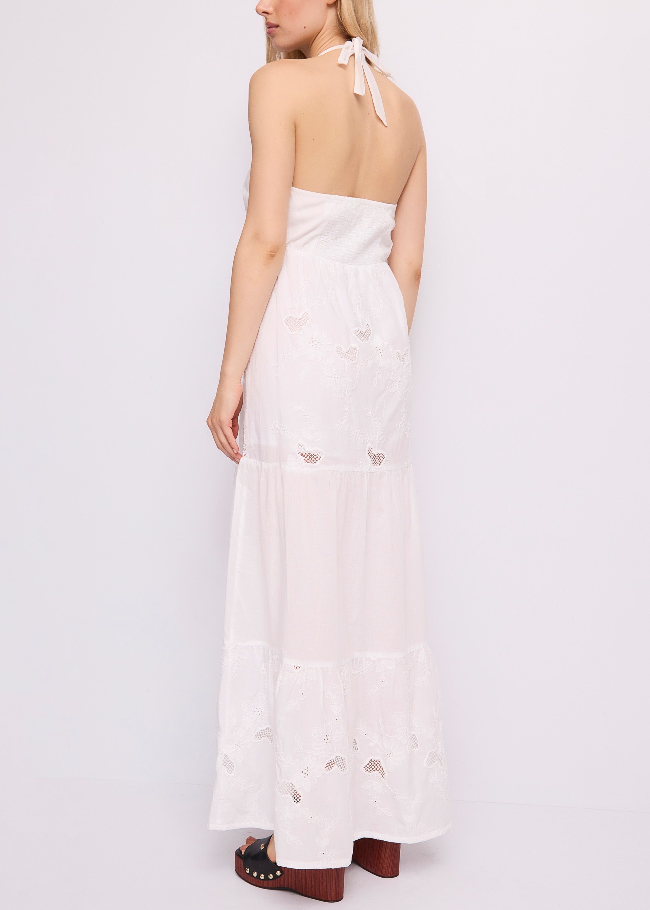 Το φόρεμα διαθέτει ένα εξαιρετικά θηλυκό, βαθύ V-ντεκολτέ με δέσιμο τύπου halter στον αυχένα, το οποίο αφήνει την πλάτη κομψά ακάλυπτη. Η άνεση συναντά το στυλ, καθώς στο πίσω μέρος της μέσης υπάρχει μια φαρδιά ελαστική φάσα (σφηκοφωλιά) που αγκαλιάζει το σώμα και εξασφαλίζει άψογη εφαρμογή. Το στοιχείο όμως που κλέβει τις εντυπώσεις είναι τα περίτεχνα, διάτρητα κεντήματα (broderie anglaise) με διακριτικά μοτίβα που διακοσμούν τα επίπεδα της αέρινης, ριχτής φούστας, χαρίζοντας μια αίσθηση πολυτέλειας και ρομαντισμού.