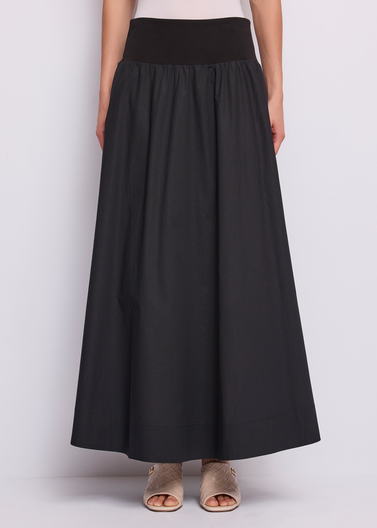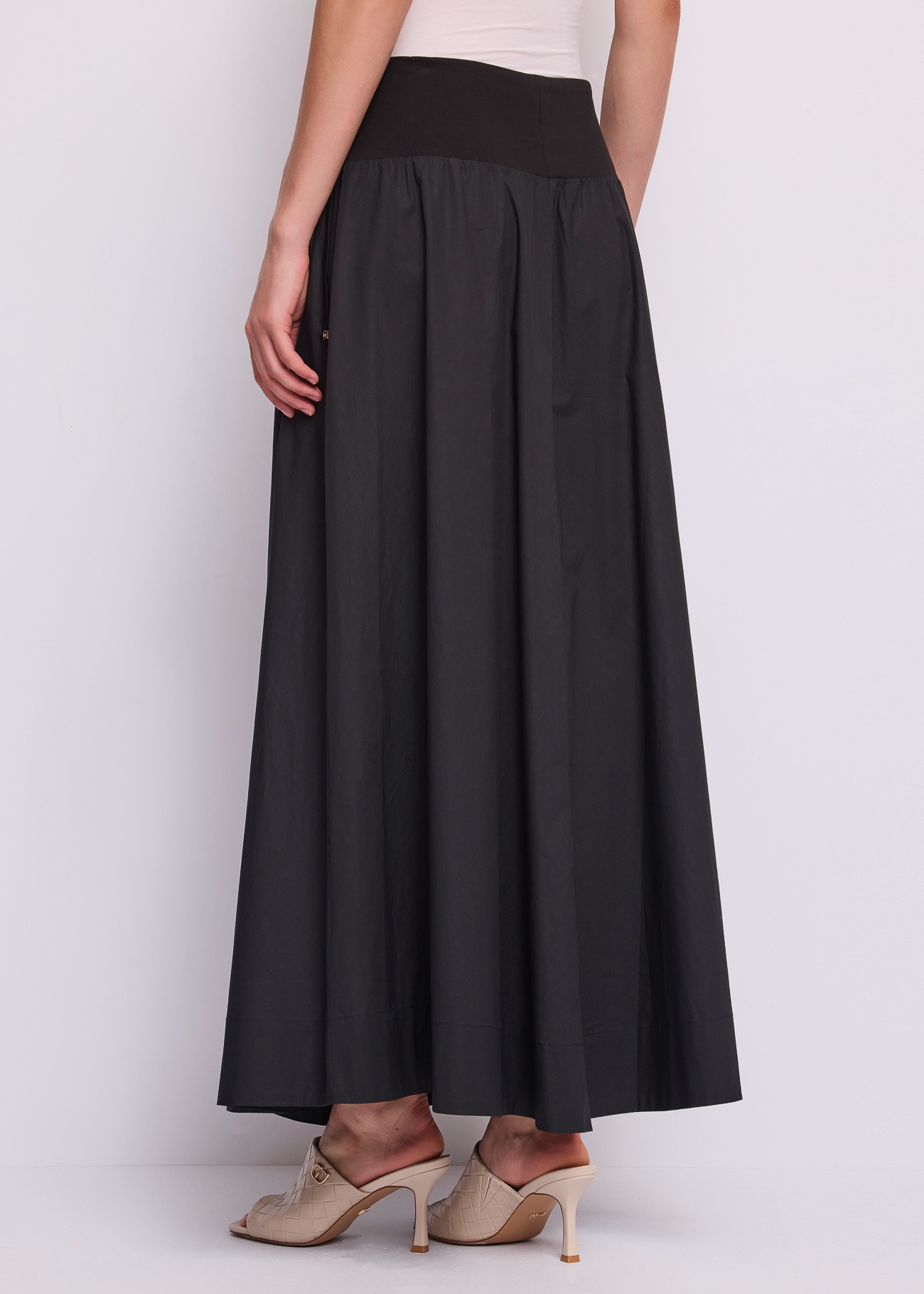 Το στοιχείο που την κάνει να ξεχωρίζει είναι ο ιδιαίτερος σχεδιασμός στη μέση: διαθέτει μια φαρδιά, επίπεδη φάσα (yoke) από ελαστικό ύφασμα που αγκαλιάζει ομοιόμορφα την κοιλιά και τους γοφούς, προσφέροντας άψογη εφαρμογή και κολακεύοντας τη σιλουέτα. Ακριβώς κάτω από αυτή τη φάσα, το ύφασμα δημιουργεί πυκνές σούρες, ανοίγοντας σε μια πλούσια, αέρινη γραμμή που χαρίζει υπέροχη κίνηση στο περπάτημα. Μια μικρή, διακριτική μεταλλική λεπτομέρεια με το λογότυπο της εταιρείας κοσμεί το πλάι.