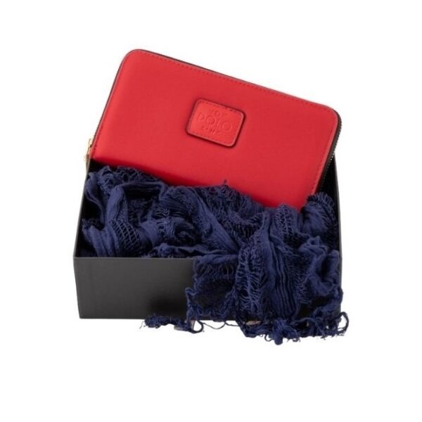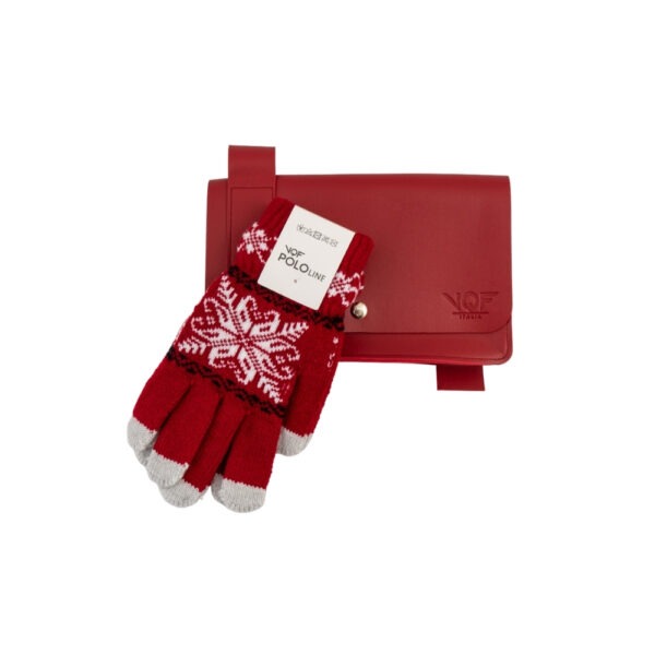 Τσαντάκι ώμου και χιαστί VQF ITALIA από συνθετικό δέρμα σε μαύρο χρώμα διαστάσεων 21 x 13 x 3 cm, με εσωτερική θήκη για κάρτες και νομίσματα και εξωτερικό κούμπωμα ασφαλείας με clip, και ένα ζευγάρι γυναικεία πλεκτά γάντια VQF POLO LINE σε κόκκινες αποχρώσεις, συμβατά με την λειτουργία αφής οθόνης κινητών τηλεφώνων και tablet, σε συσκευασία δώρου.